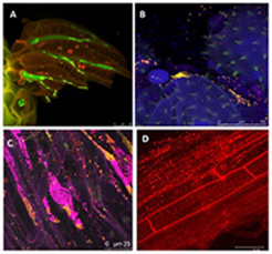 Abbildung: Laserscanning-Mikrofotografie von Pflanzenhabitaten. Die Bakterien wurden durch Fluorescencein situ hybridization (FISH) sichtbar gemacht (A-C) und zeigen A) ein Moosblatt, B) Bakterien an Kürbispollen, C) Bakterien im Salat, und D) Rapswurzeln, die mit einem Ds Red-markierten Biocontrolagent P. trivialis 3Re2-7 inokuliert wurden (aus Berg et al. 2013).